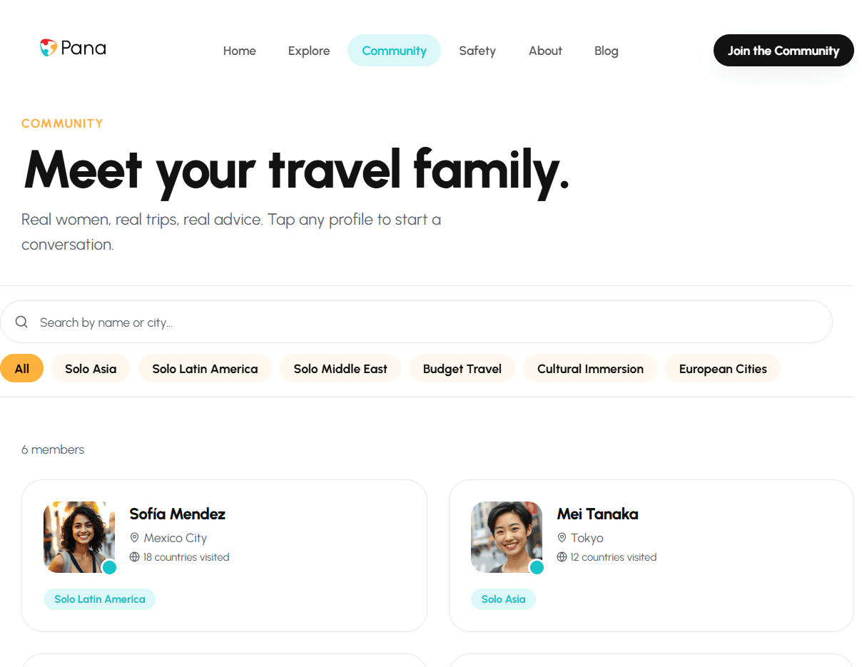 From there, the concept took shape around three pillars: staying connected and safe, belonging to a community of experienced women travelers, and discovering the world through people you can actually trust.