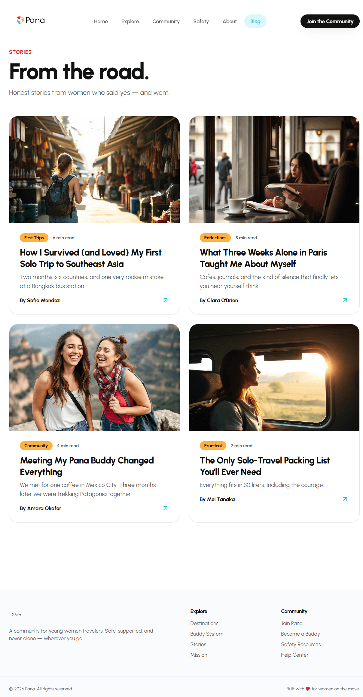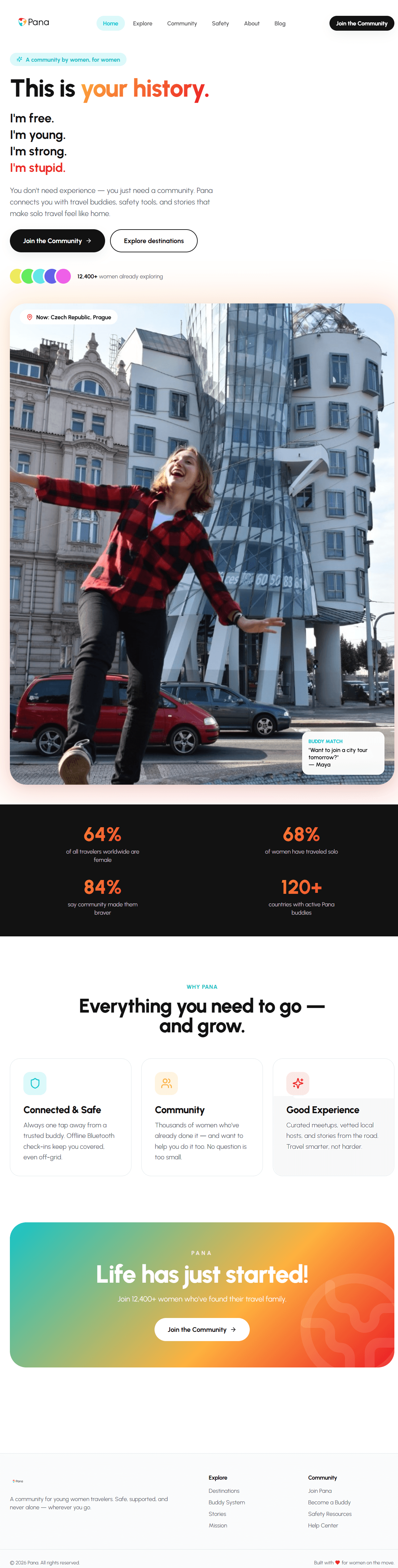 The research pointed to something most travel platforms ignore: young women traveling for the first time aren't just looking for destination guides. They need confidence, community, and a safety net that feels human — not clinical.