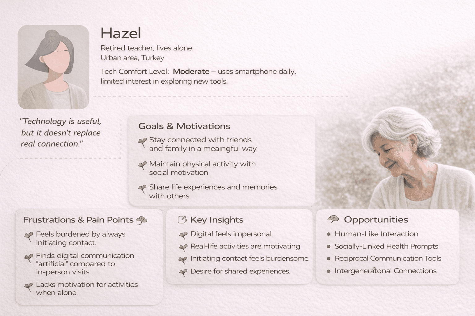 The problem wasn't that elderly people lacked technology. They had phones, tablets, messaging apps. The problem was that the social connection infrastructure around them had quietly broken down. Communication had become one-sided, effortful, and artificial feeling. And nobody was designing for that.