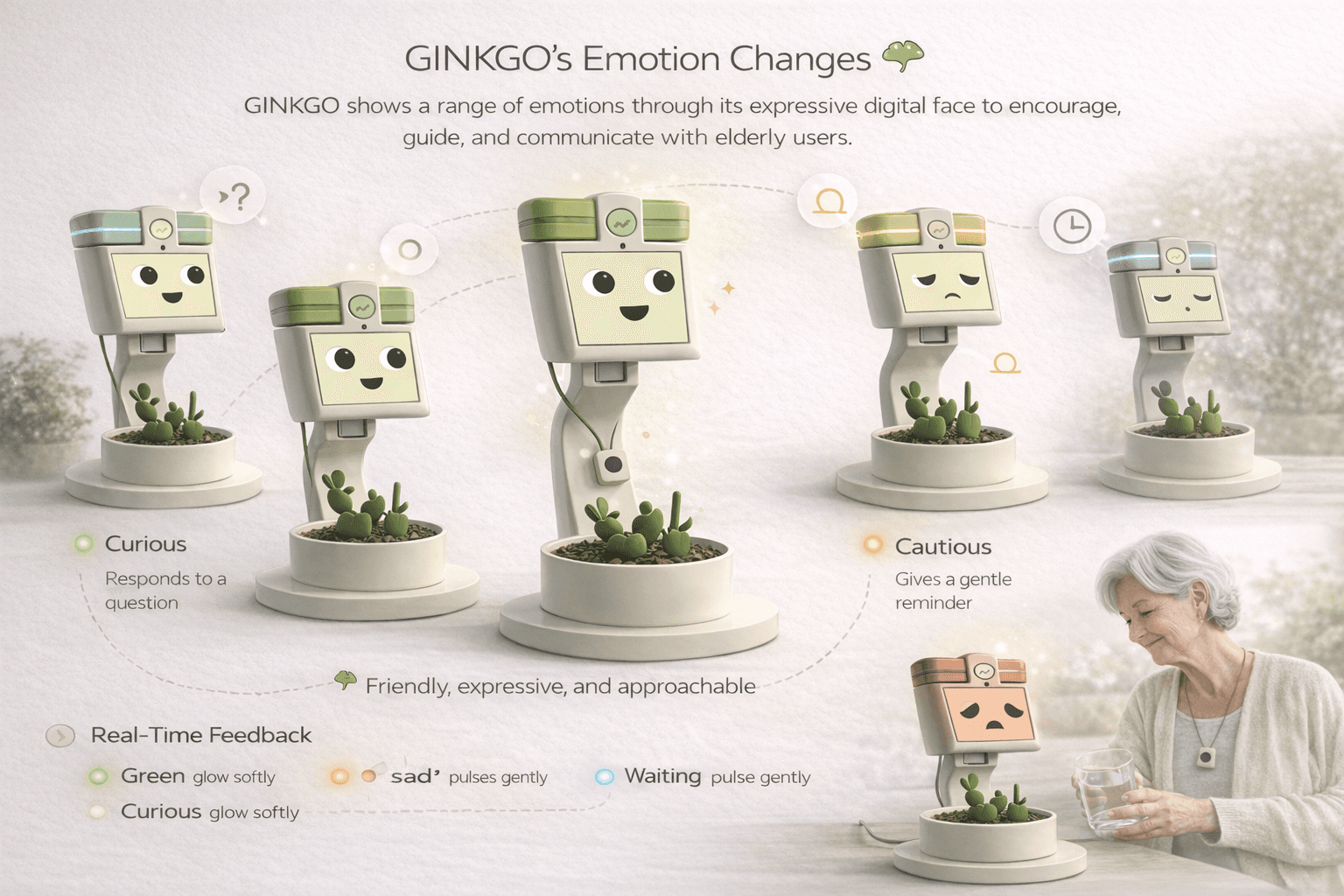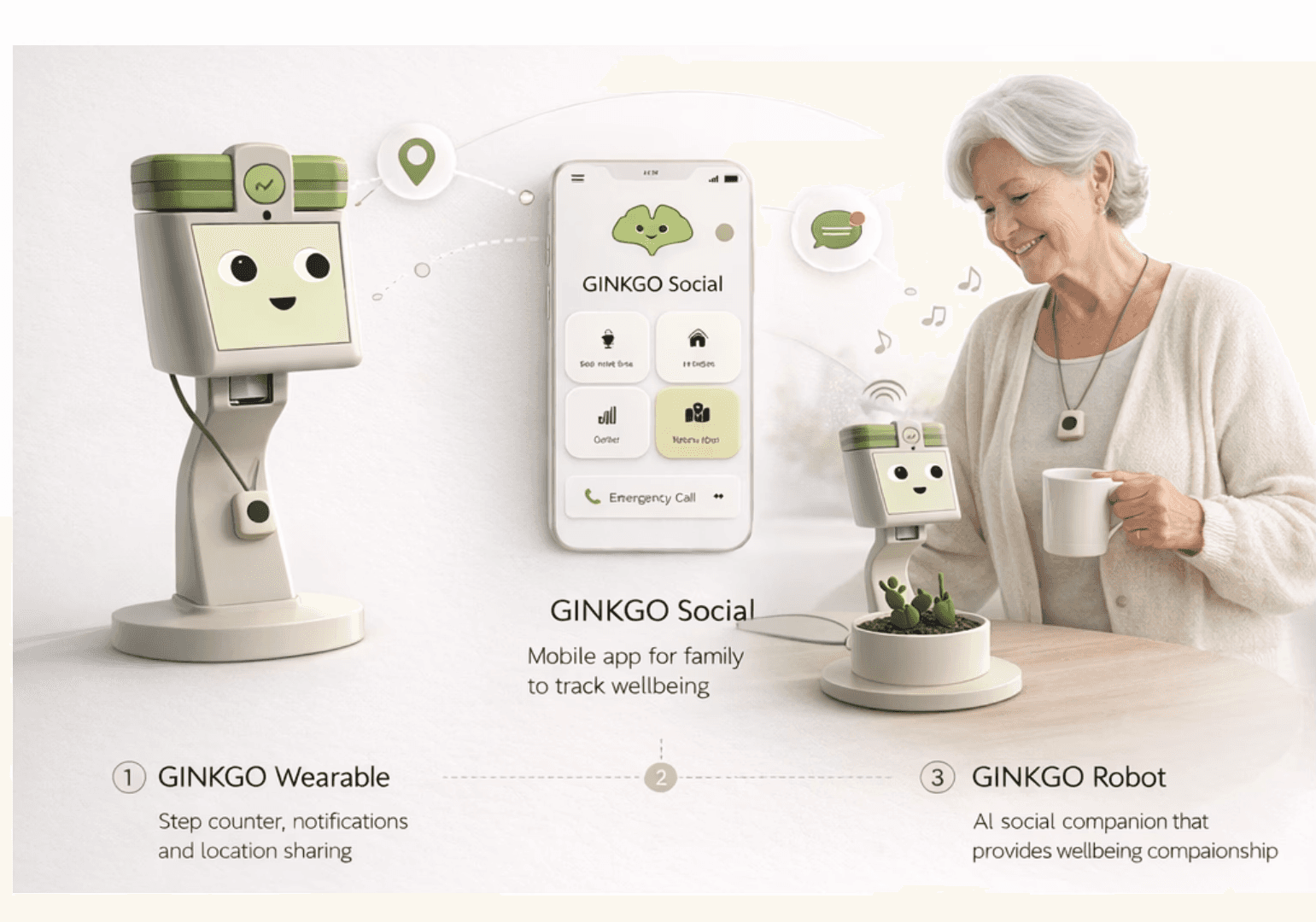 Ginkgo is an AI-powered companion device for adults aged 65 to 73, designed to support healthy ageing through socialization, activity and daily routine. Named after the Ginkgo Biloba tree, which symbolizes longevity, resilience and peace.