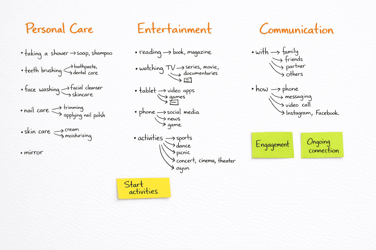 From there I ran interviews, asking not about technology or products, but about daily life, connection, and routine. I also dug into demographic data, existing research on ageing, and the landscape of products already designed for this space.