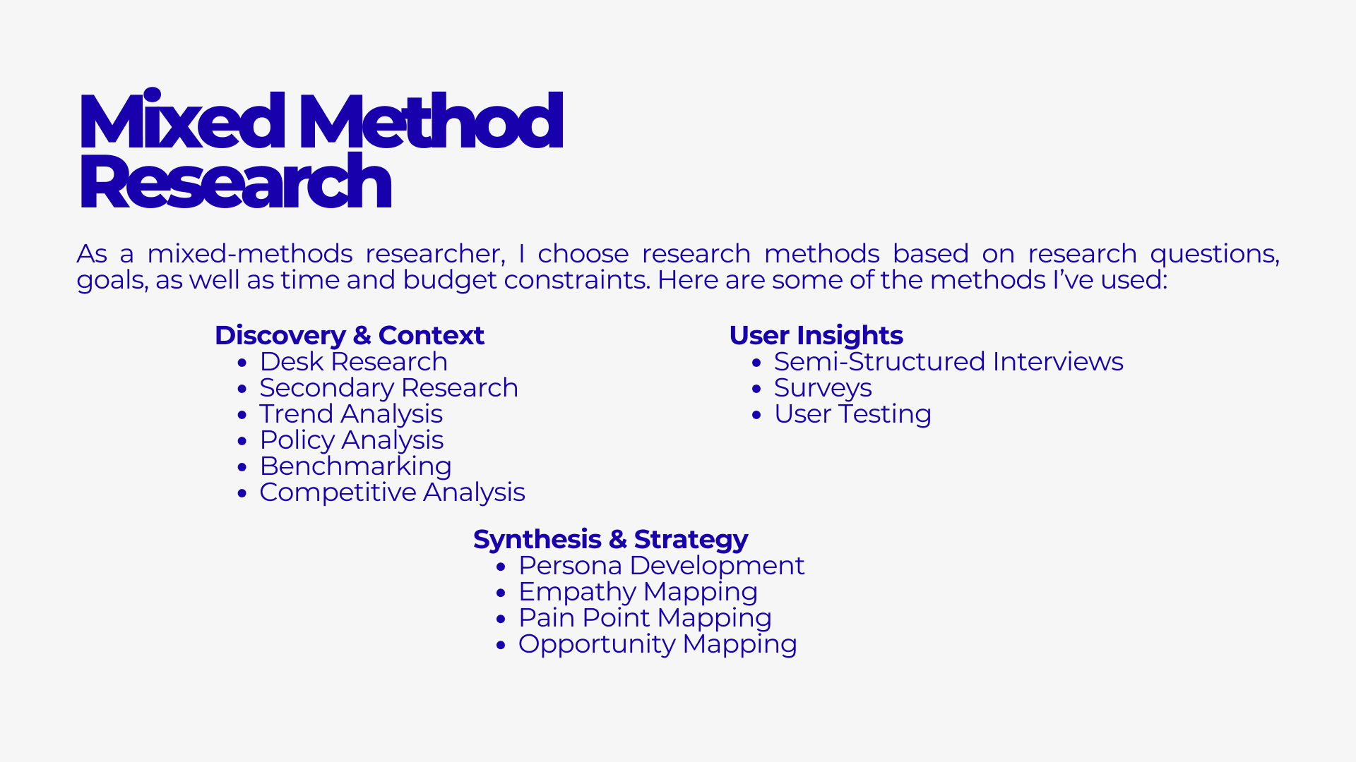 This user experience research portfolio highlights my work in uncovering user needs, generating insights, and informing design decisions. It includes two case studies: